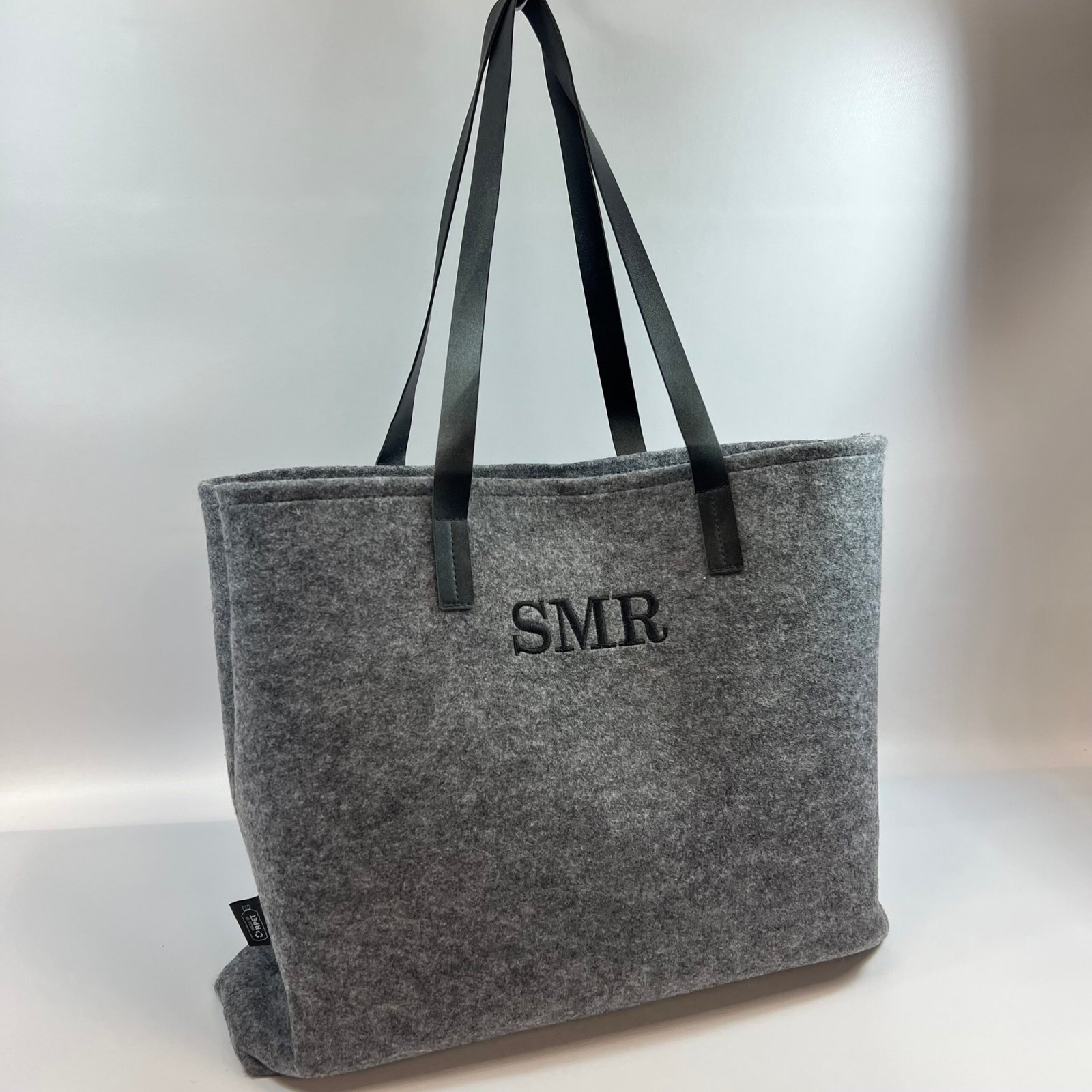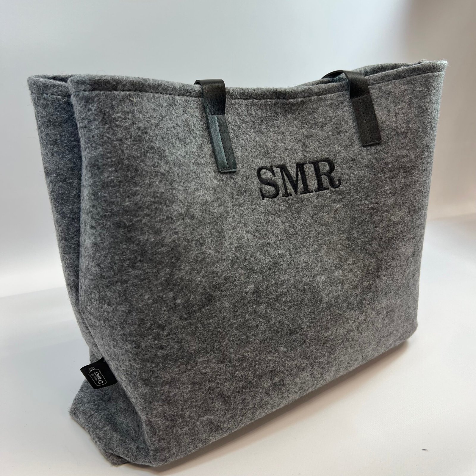 Bolsa fabricada en fieltro 100% RPET, con asas de cuero sintético.
